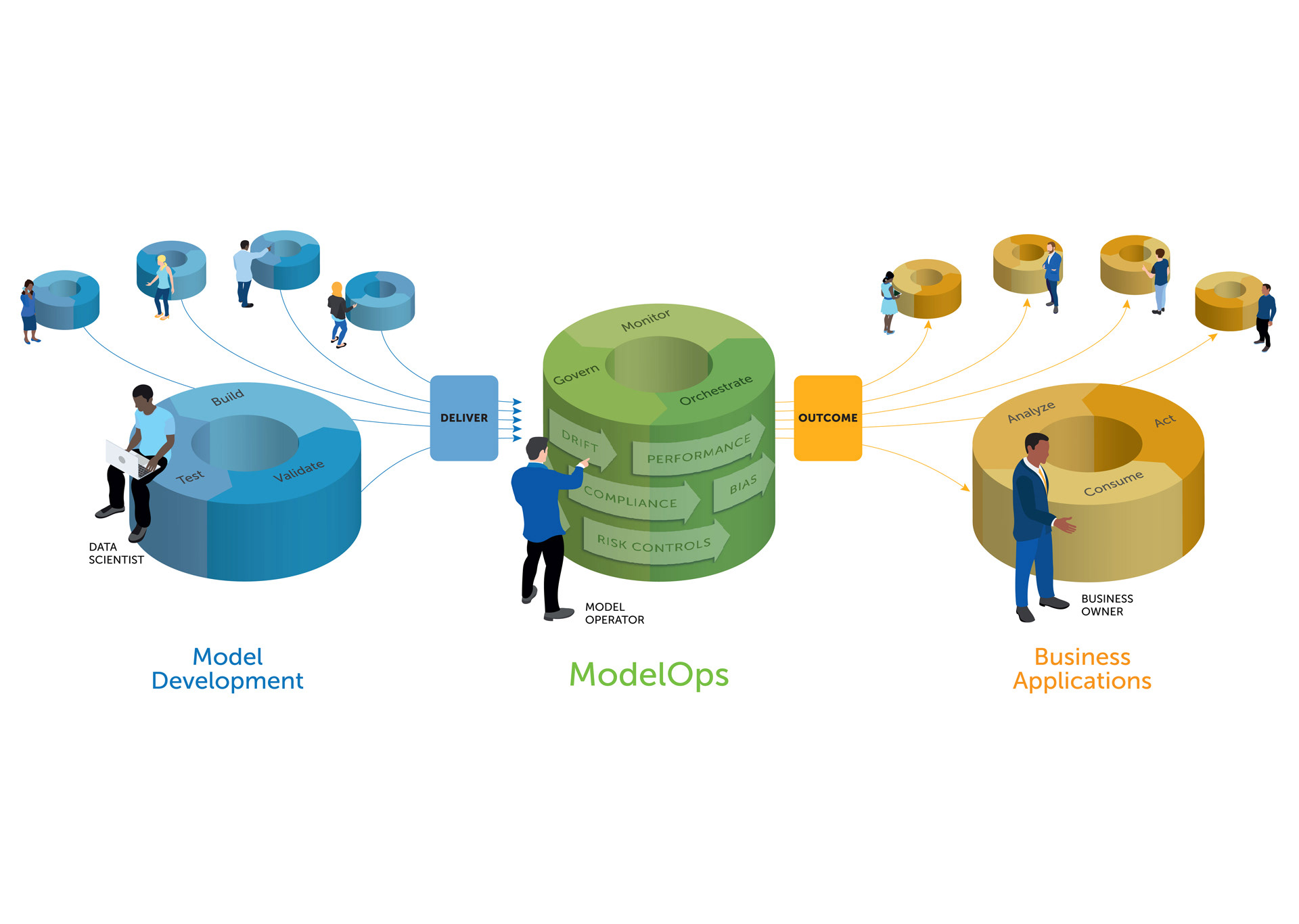 Diagram for ModelOps to illustrate a complex set of automated AI processes in the simplest possible way.
